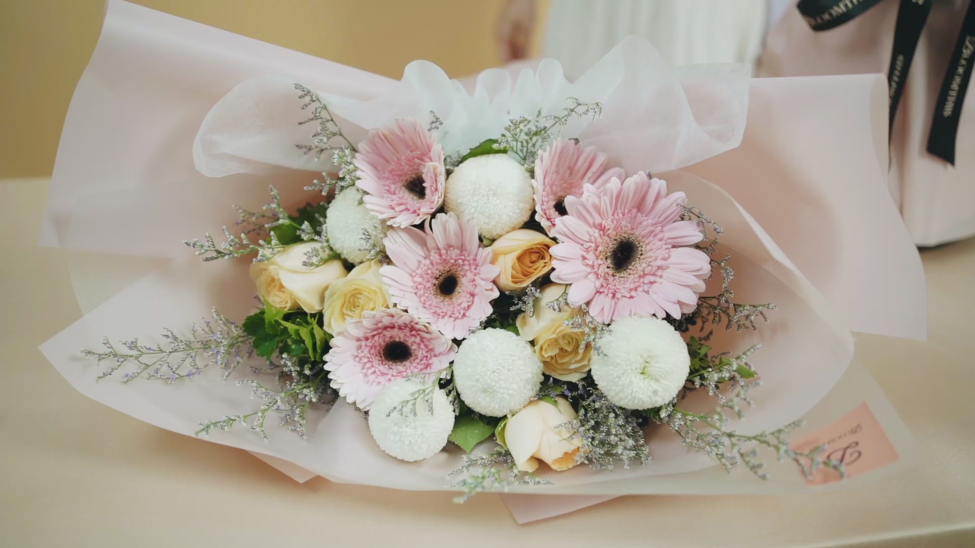 Medium: Pink Gerbera (4-5 stalks), Champagne Rose (4-5 stalks), White Ping Pong, Purple Caspia & Tea Leaves