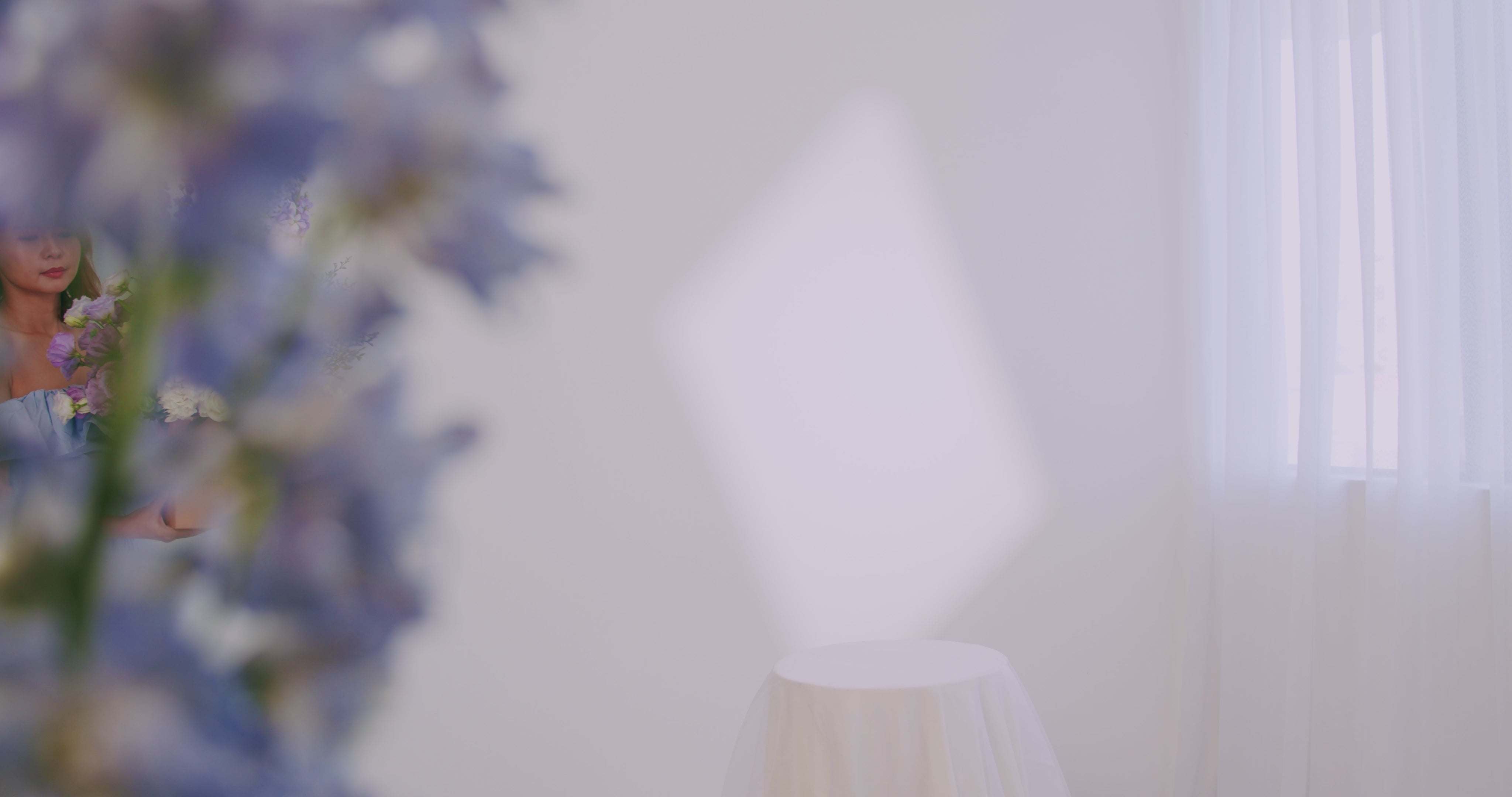 Purple Matthiola (2-3 stalks), Lilac Matthiola (2-3 stalks), White Hydrangea (1-2 stalks), White Rose (4-5 stalks), Ocean Song Rose (4-5 stalks), Lilac Ping Pong (2-3 stalks), Lilac Eustoma (4-5 stalks), White Dendobrium, White Anthurium, Purple Caspia, Eucalyptus Cineria